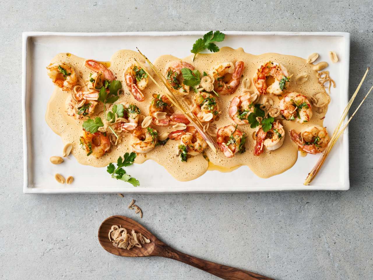 Sauce erhitzen und schaumig mixen. Garnelen mit der Koriander-Bratbutter, dem Zitronengras und der Sauce anrichten. Alles mit den Korianderblättern garnieren und mit gerösteten Erdnüssen und Röstzwiebeln bestreuen.
