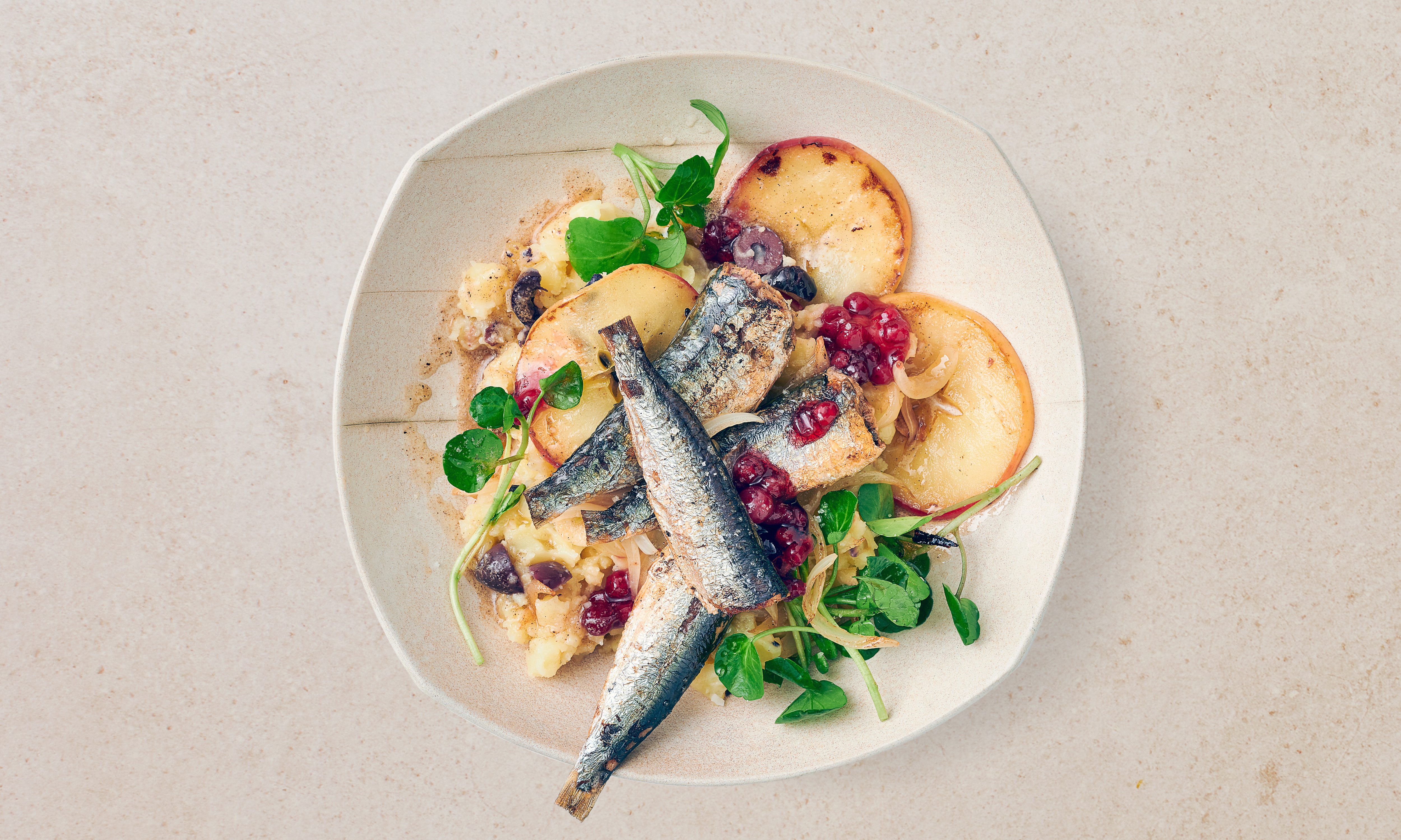 Das ist Simple Kitchen: Sardinen aus der Dose mit Kartoffelstampf, Apfelscheiben, Zwiebelspalten, Brunnenkresse und Preiselbeeren verfeinern.