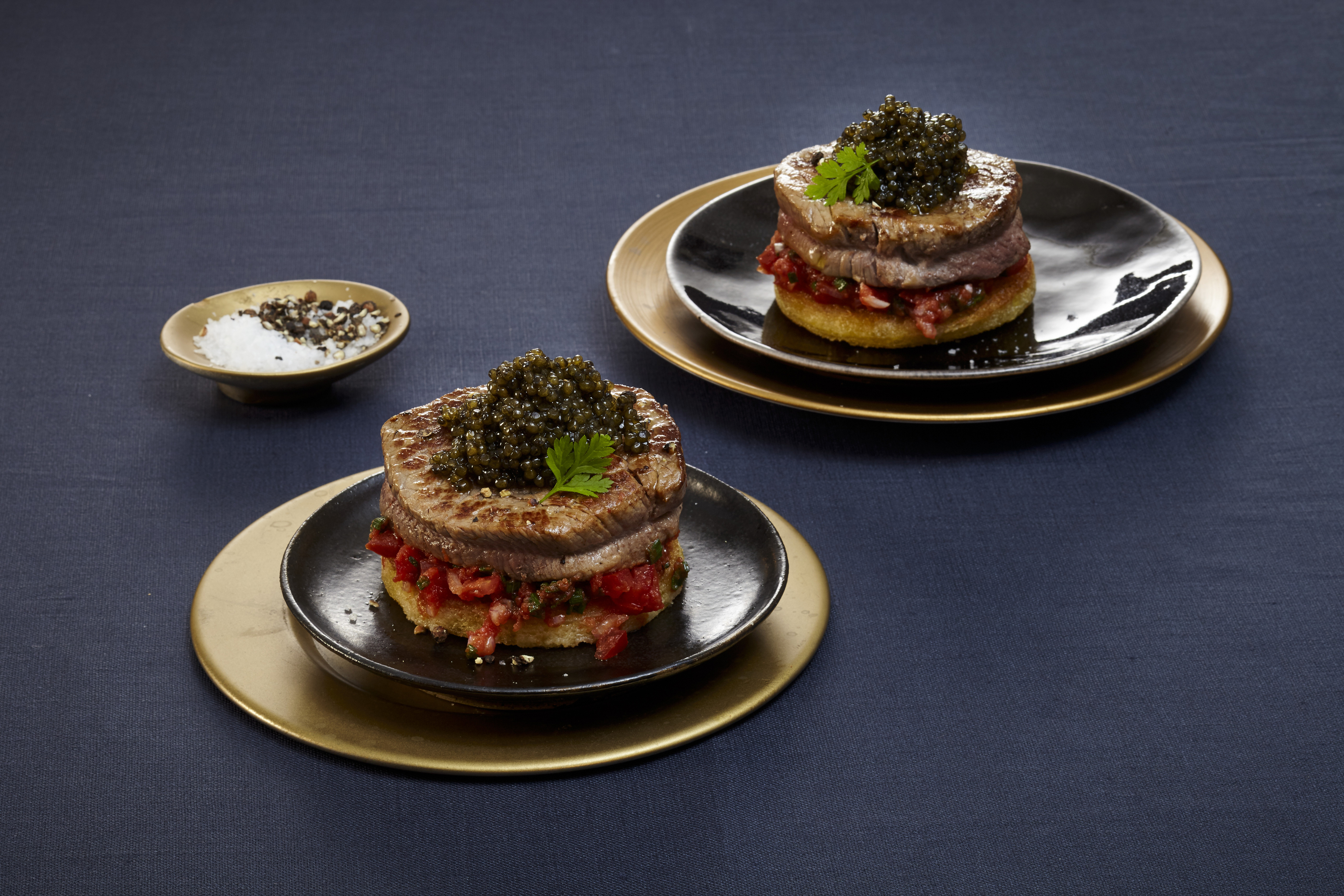 Schlemmerschnitte de luxe: Buttercroûtons mit scharfer Tomatensugo, Rinderfiletmedaillons und feinem Kaviar vom Stör.