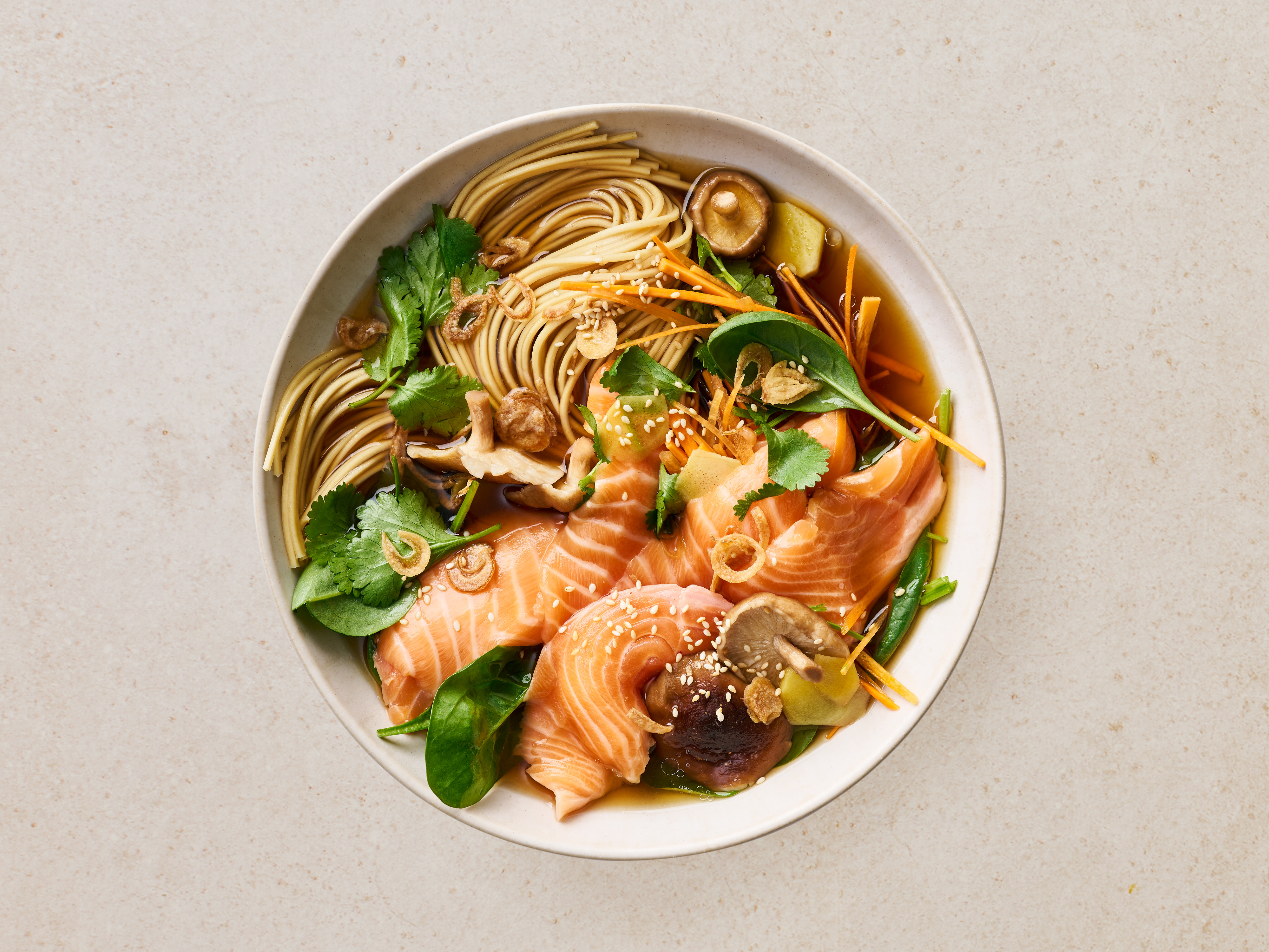 Sie mögen Ramen? Dann probieren Sie unbedingt unsere schnelle Variante für die japanische Nudelsuppe mit Lachsforelle, Pilzen, Nudeln und Röstzwiebeln.