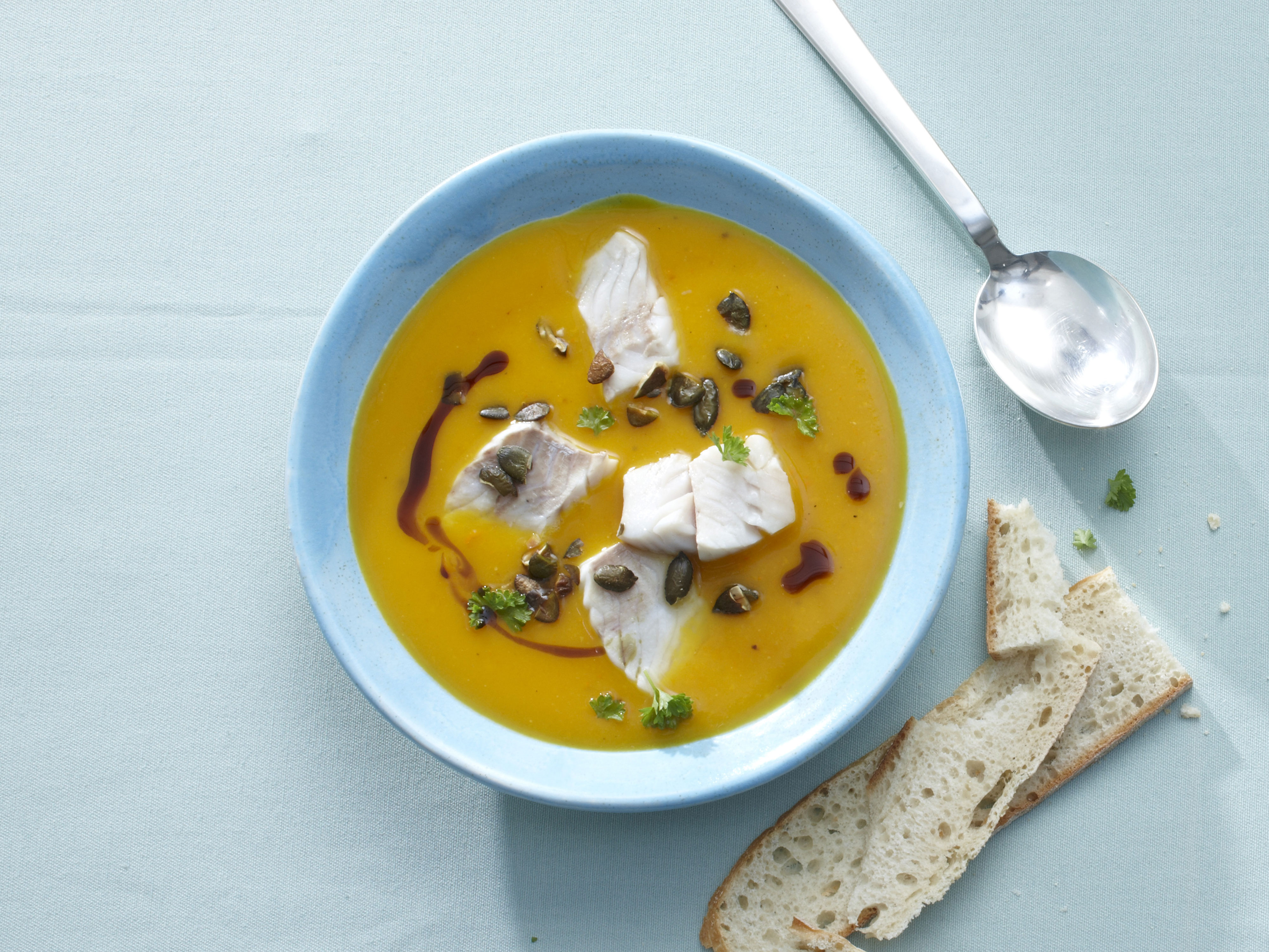 Das bissfeste Topping aus pochiertem Seelachsfilet und Kürbiskernen macht aus dem cremigen Süppchen ein leichtes Hauptgericht mit Aufwärmfaktor.