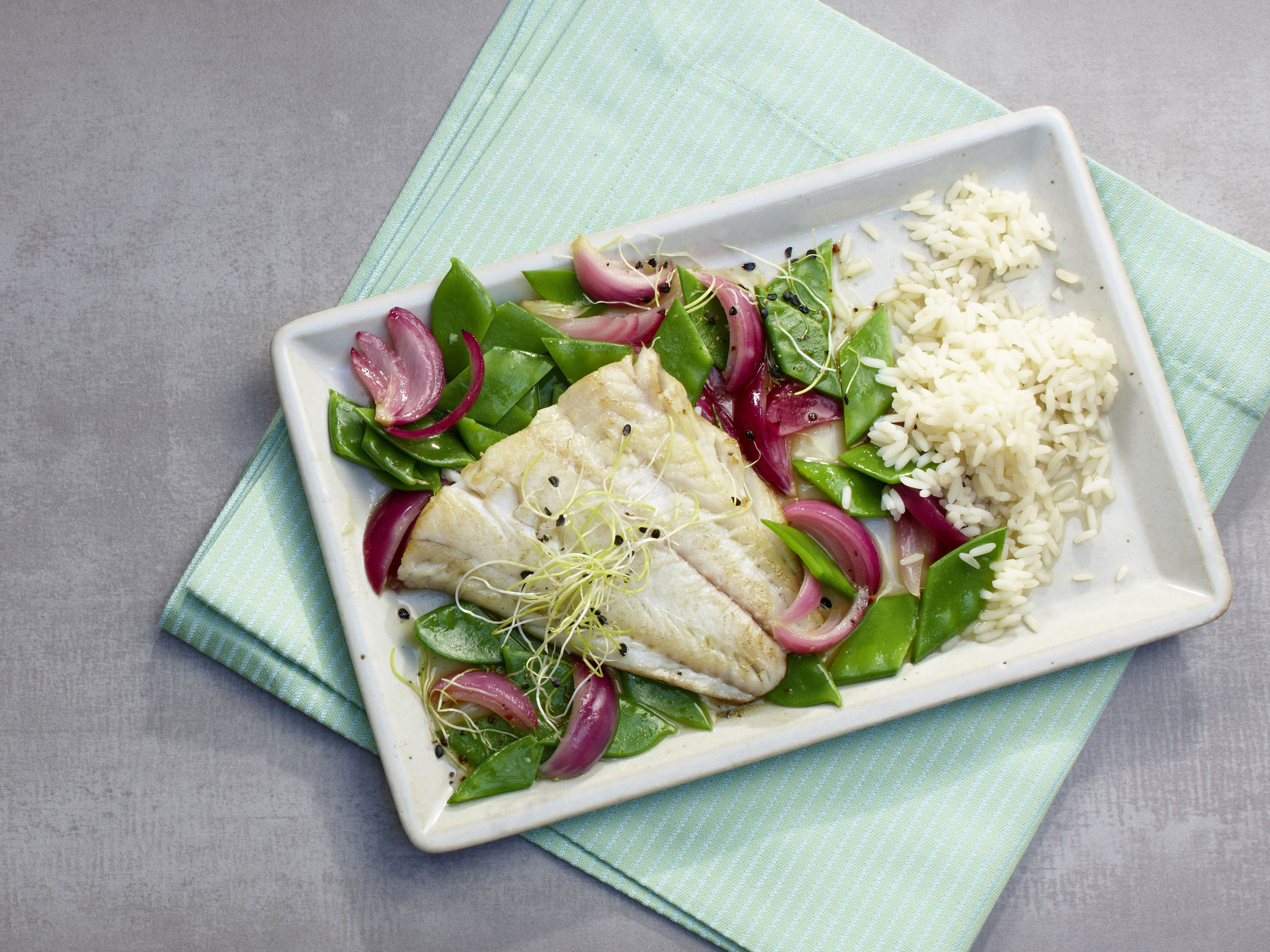 Fürs Auge und als extra Vitaminkick landen auf dem knackigen Gemüse und dem gebratenen Seelachsfilet ein paar würzige Sprossen.