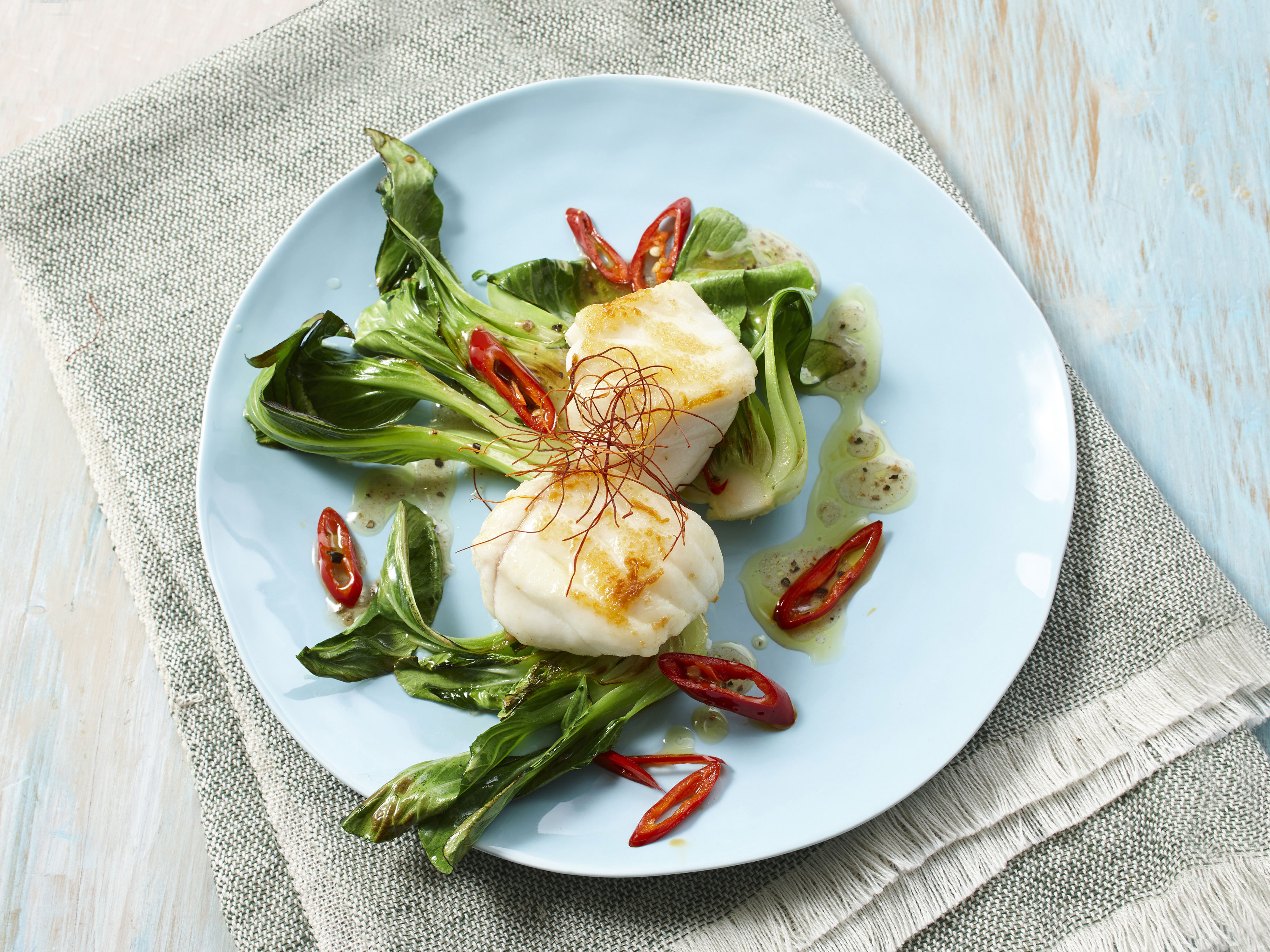 Blütenweißer Seeteufel kombiniert mit gebratenem Pak Choi und asiatischen Aromen: Das passt perfekt und ist Liebe auf den ersten Bissen.