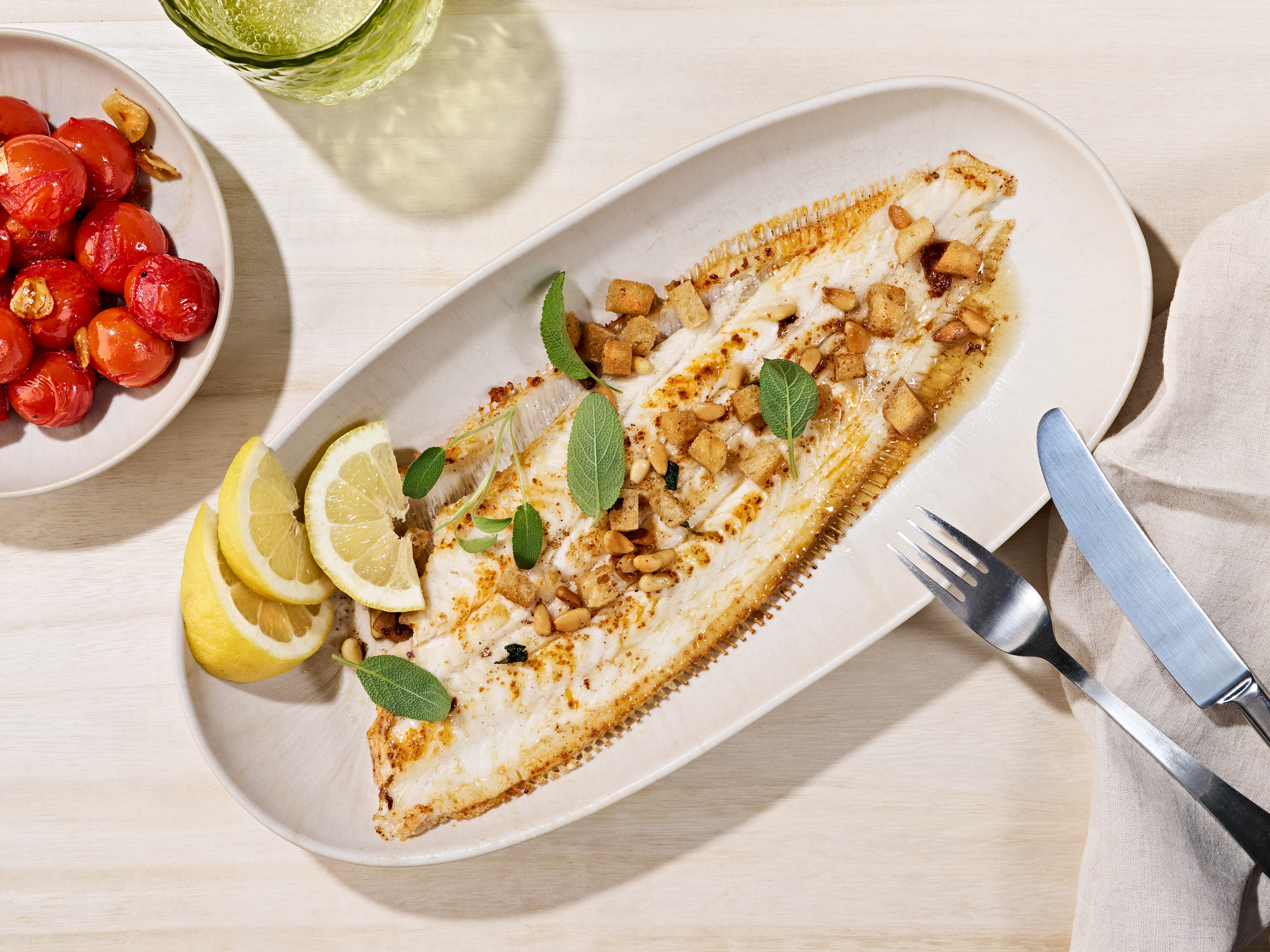 - 4 Die Seezungen nach der Bratzeit nebeneinander auf ein mit Backpapier ausgelegtes Backblech setzen und im Ofen warmhalten. Brotwürfel und Pinienkerne auf die beiden Pfannen verteilen und kurz braten. Butter und den geschnittenen Salbei zugeben und aufschäumen lassen. Im Anschluss mit dem restlichen Zitronensaft ablöschen.