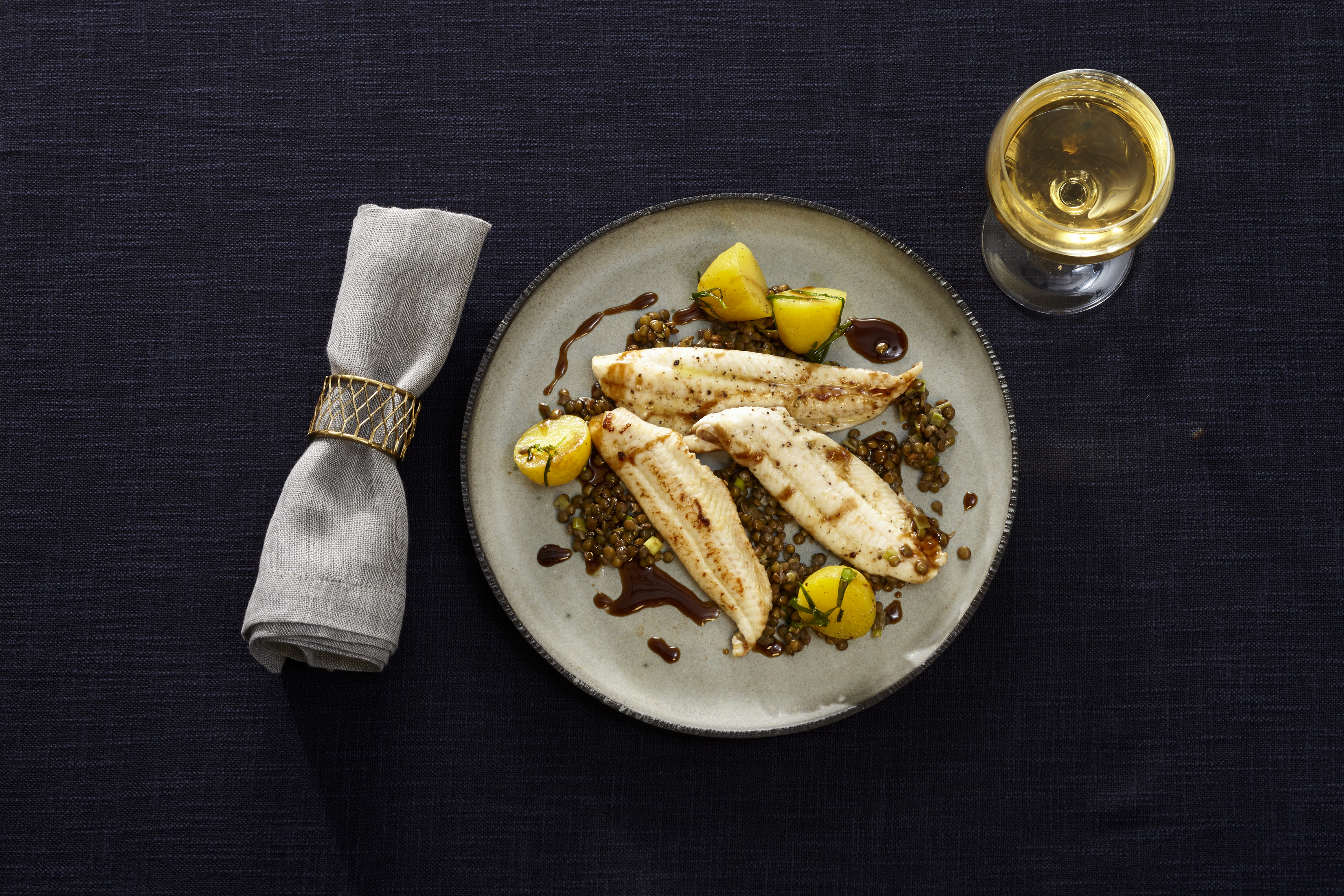 Lässt sich für das nächste Festessen besonders gut vorbereiten: Gebratene Seezungenfilets mit Linsen, Estragonkartoffeln & Balsamicosauce.