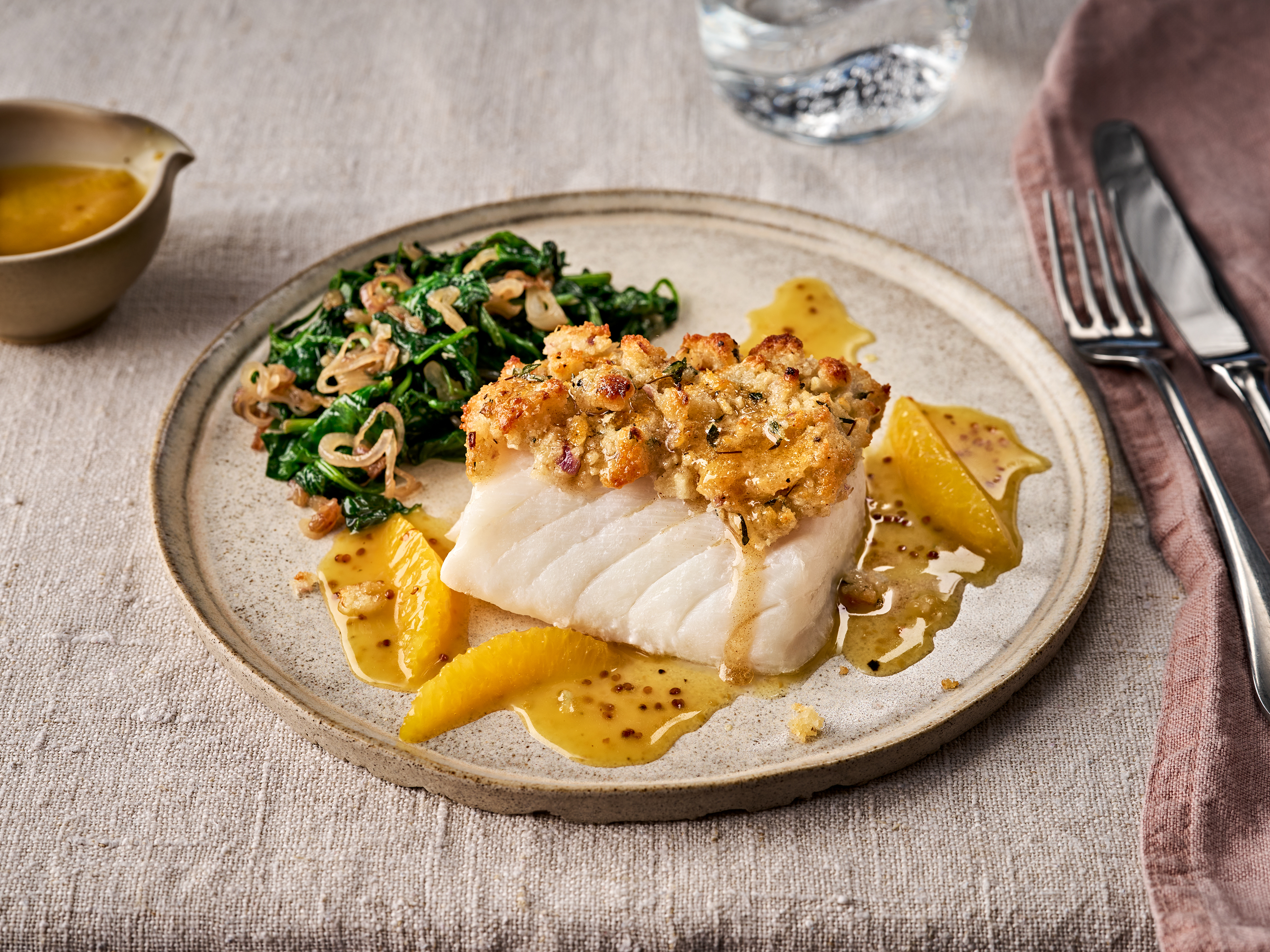 - 4 Die restlichen zwei Schalotten in feine Ringe schneiden, zusammen mit der restlichen Butter erhitzen und leicht bräunen lassen. Babyspinat zugeben, mit Salz und Muskat würzen und zusammenfallen lassen. Spinat und Skrei anrichten und mit der Orangen-Buttersauce servieren.