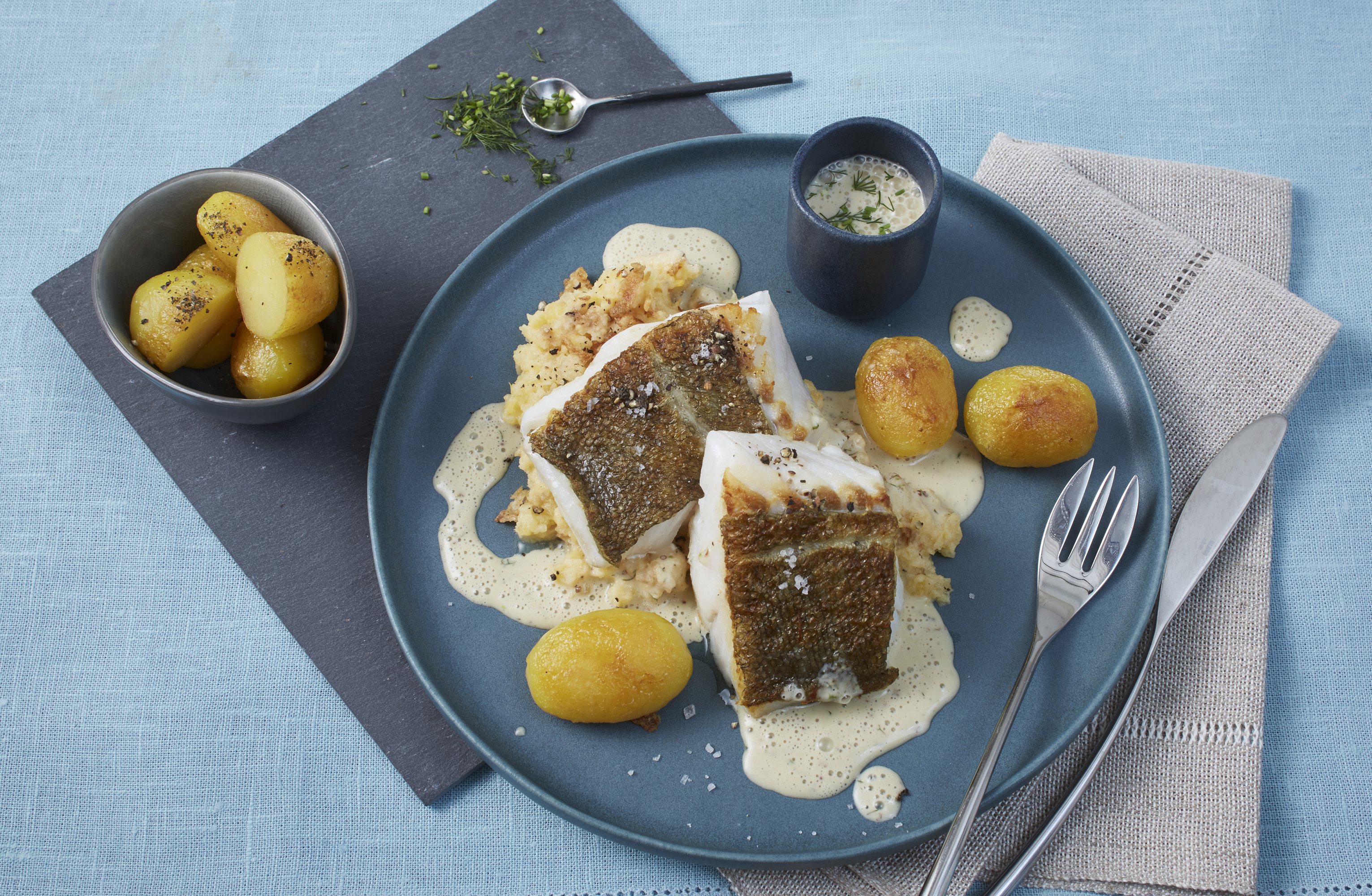 Hier trifft der Winterkabeljau Skrei auf das Wintergemüse Steckrübe: Kross gebratenes Skreifilet auf Steckrübenstampf, Kräutersenfsauce & Röstkartoffeln.