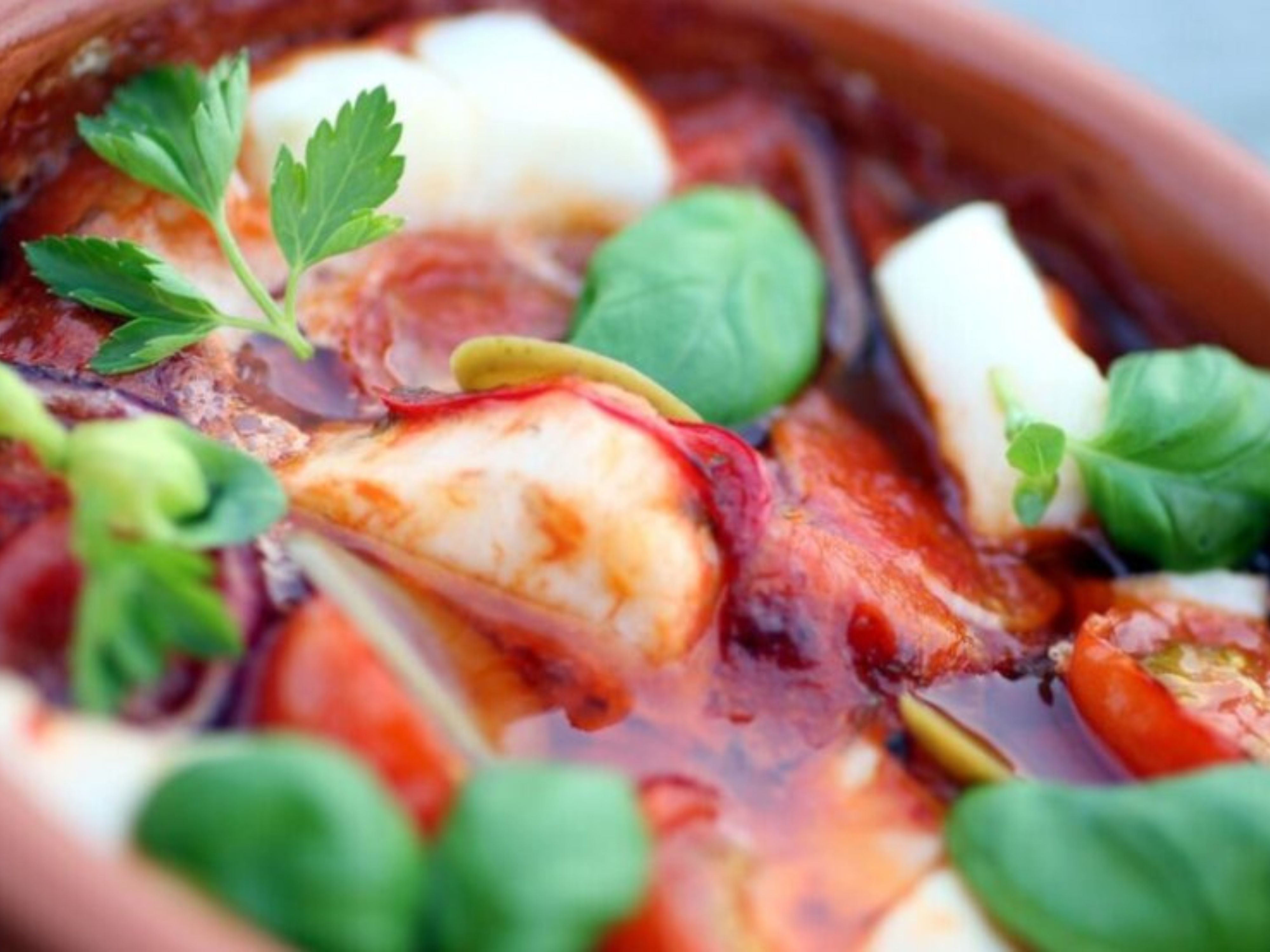 - 3 Tomaten in Scheiben schneiden. Das Skreifilet und die Tomatenscheiben in eine ofenfeste Form legen. Die Tomatensauce gleichmäßig darüber verteilen. Alles mit etwas Olivenöl beträufeln und im Backofen für ca. 20 Minuten backen.