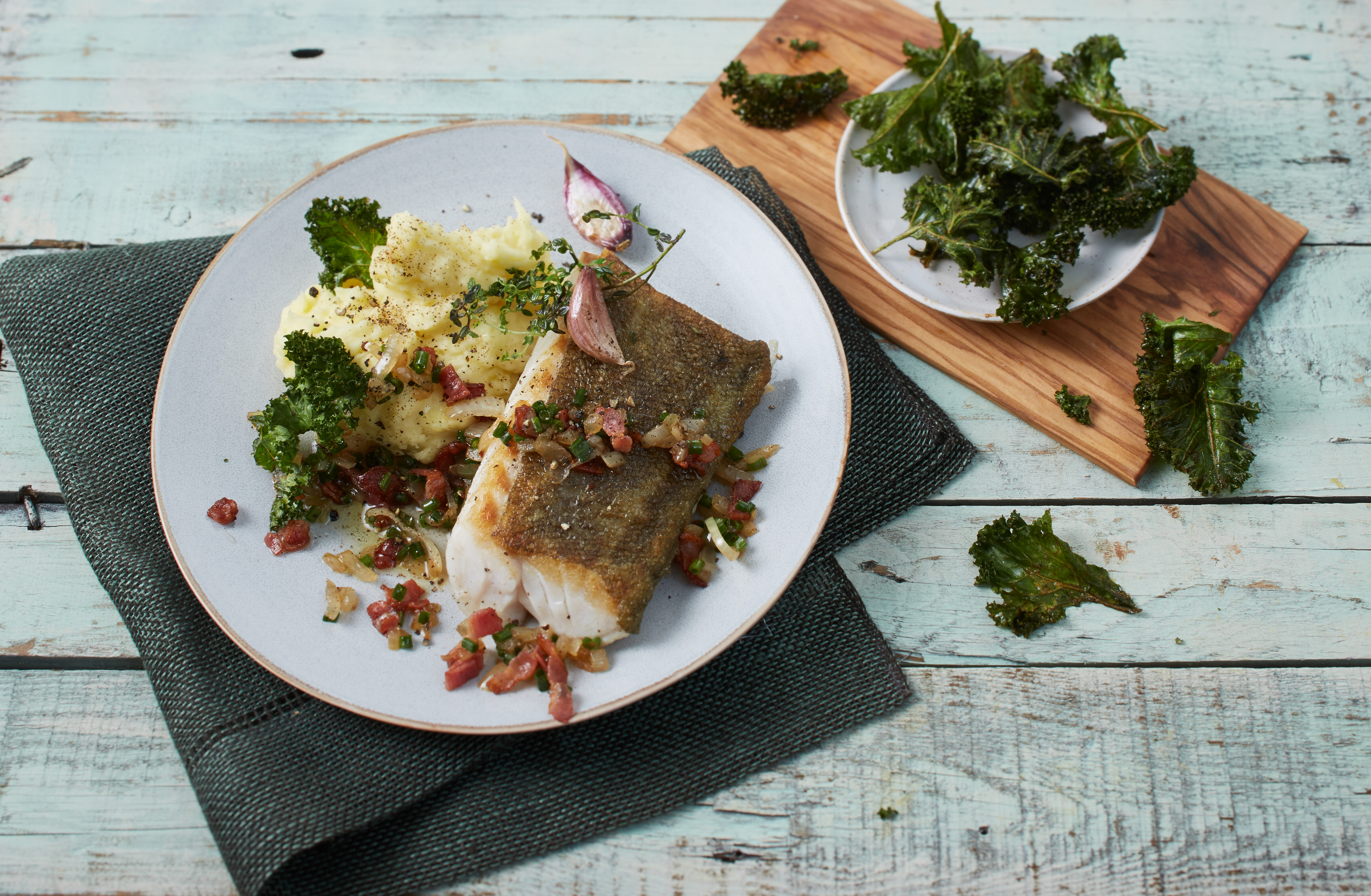 Wie für die kalten Wintertage gemacht: Knusprig gebratenes Skreifilet mit Kartoffelstampf, selbstgemachten Kale Chips und deftiger Speckstippe.