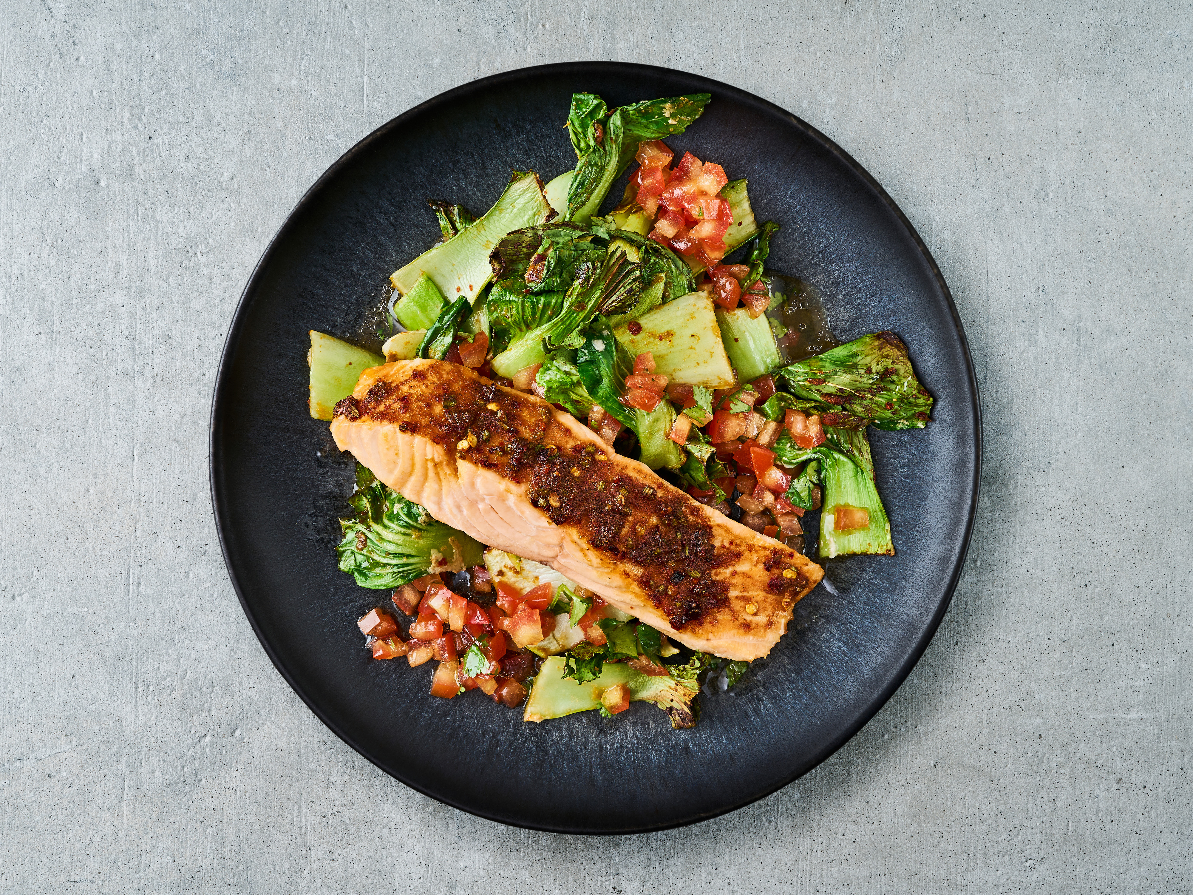 Die Marinade aus getrocknetem Ingwer, Knoblauch und Sojasauce wird auf dem Lachsfilet zur würzigen Kruste. Dazu gibt’s Pak Choi und frische Tomaten-Salsa.
