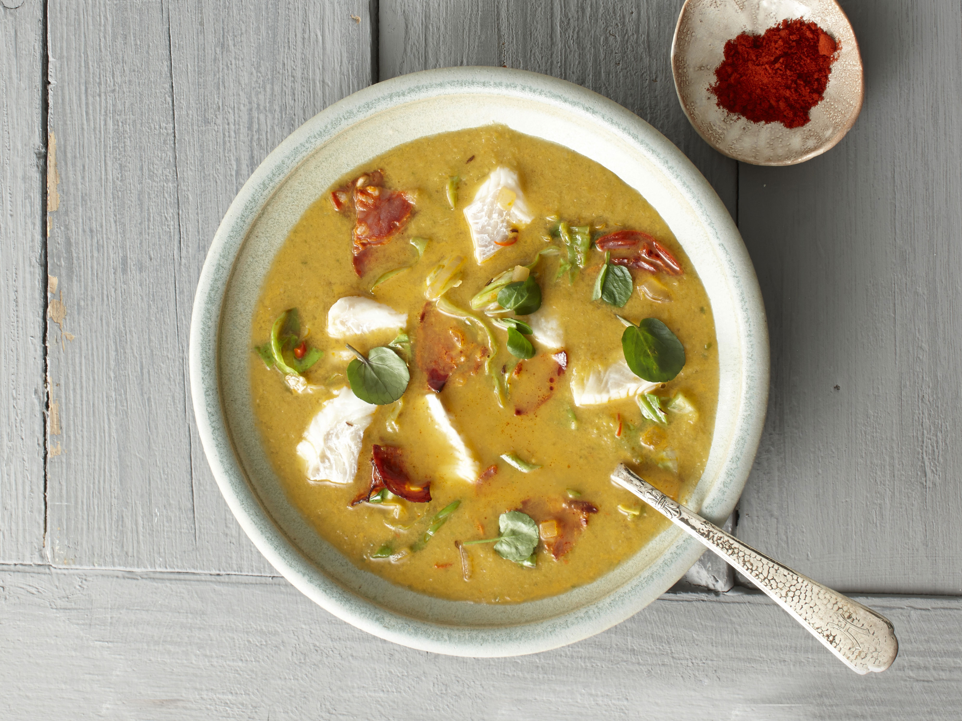 Eine deftige Fischsuppe auf der eher untypischen Basis von Spitzkohl, die mit ihrer pikanten Schärfe an warmen wie an kalten Tagen schmeckt.