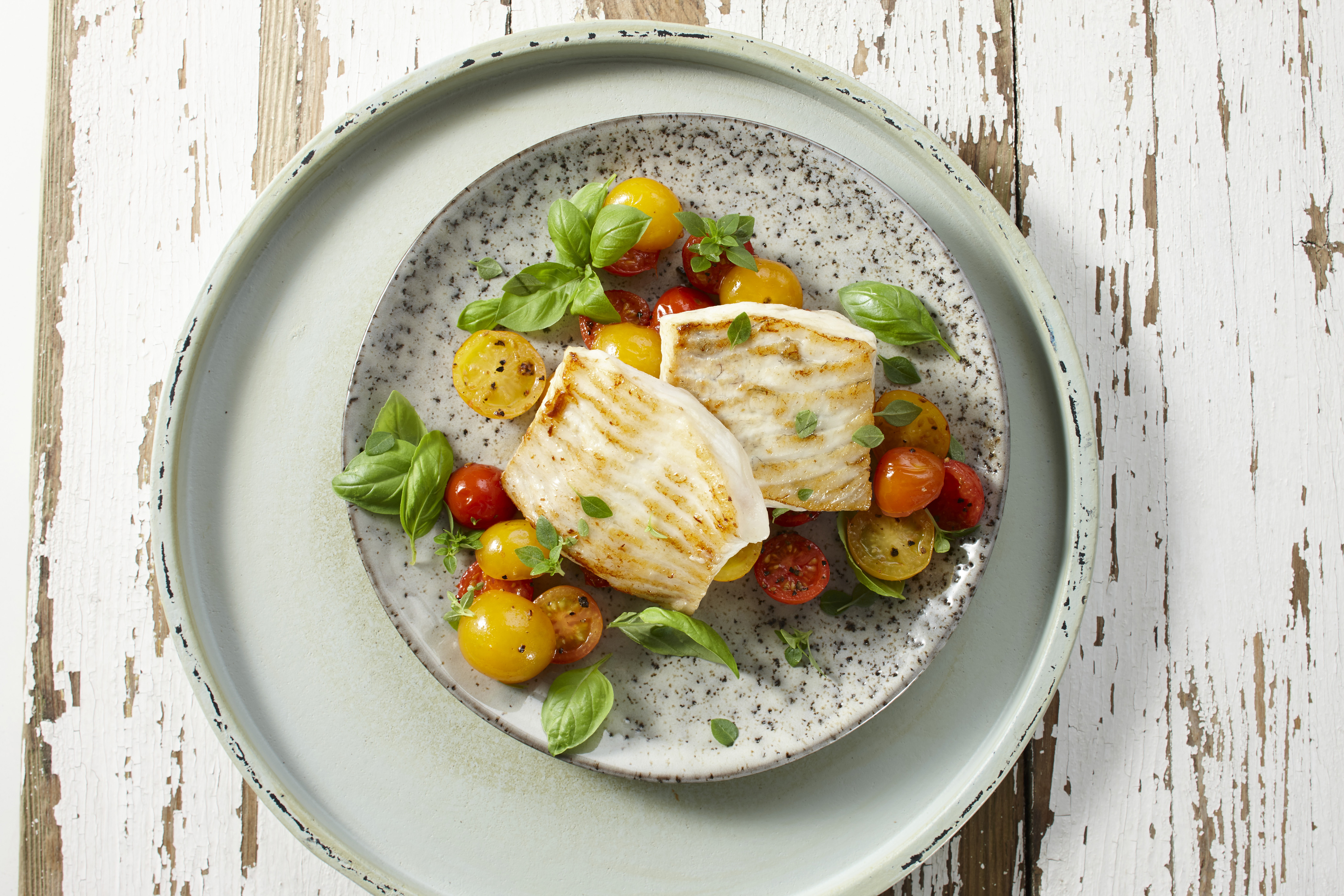 Blütenweißer Steinbutt auf bunten Tomaten mit aromatischem Pesto und frischem Basilikum. Klingt nach einem Sommertraum? Schmeckt auch so!