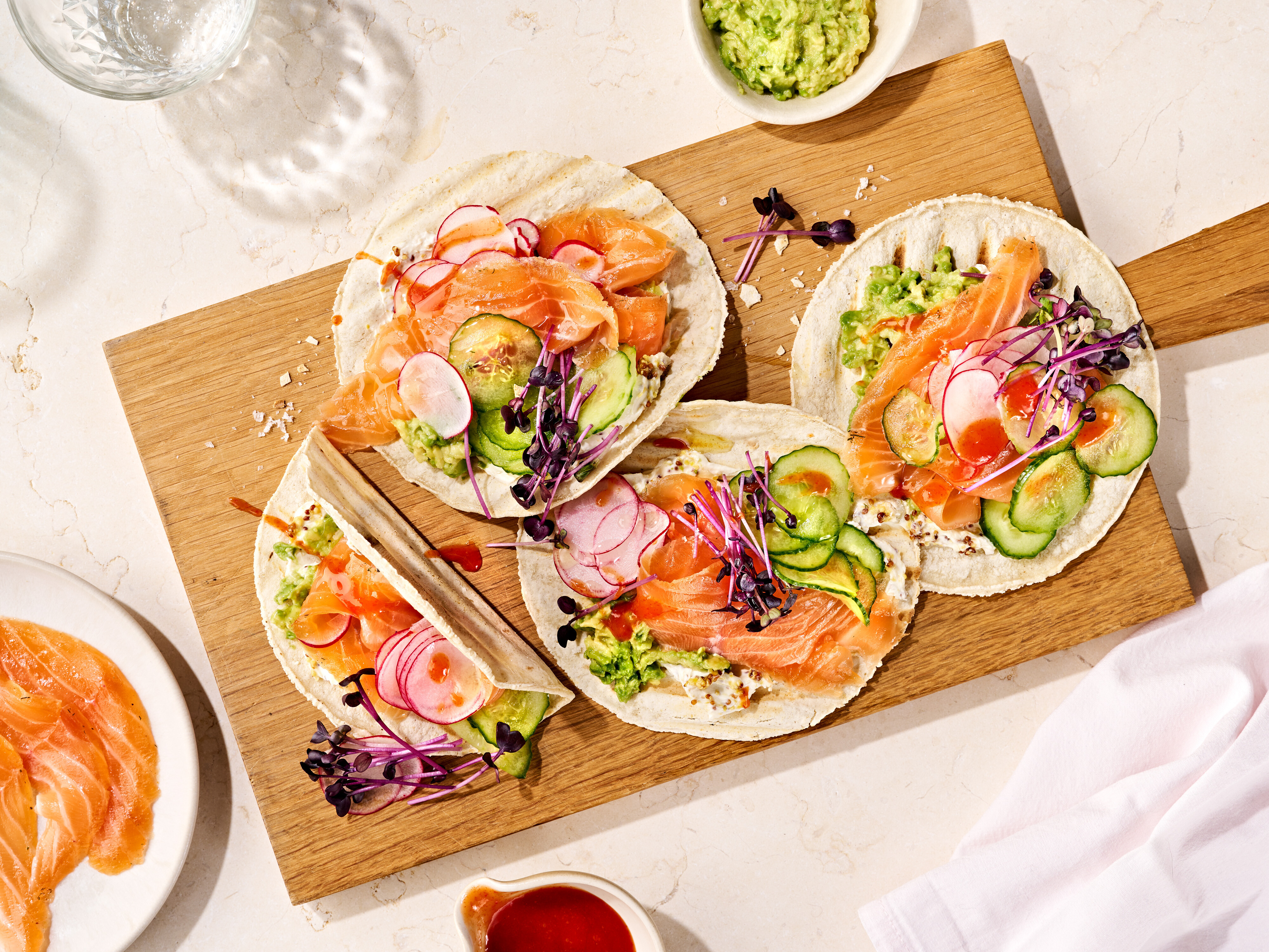 Diese bunten Tacos sind das perfekte Fingerfood. Gefüllt mit Graved Lachs, knackigem Gemüse, Guacamole und Frischkäsecreme passen sie zu jedem Anlass: ob zum Brunch, beim Buffet, als Snack oder Abendessen.