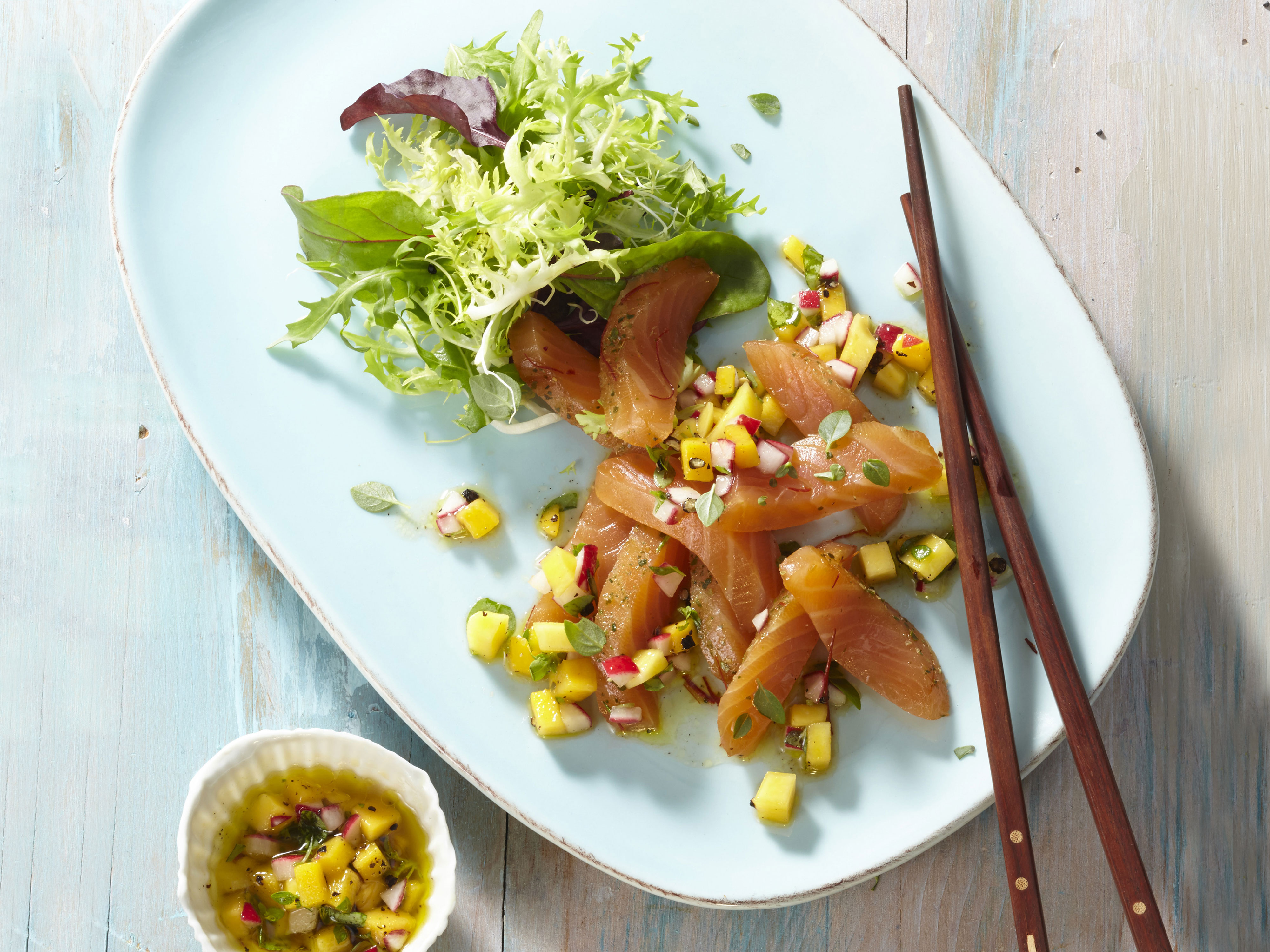 Thailachs in etwa 5 mm starke Scheiben schneiden. Salat waschen und trocken schleudern. Lachs und Salat auf Tellern anrichten und mit gezupften Buschbasilikumblättern bestreuen. Mango-Salsa dazu servieren.