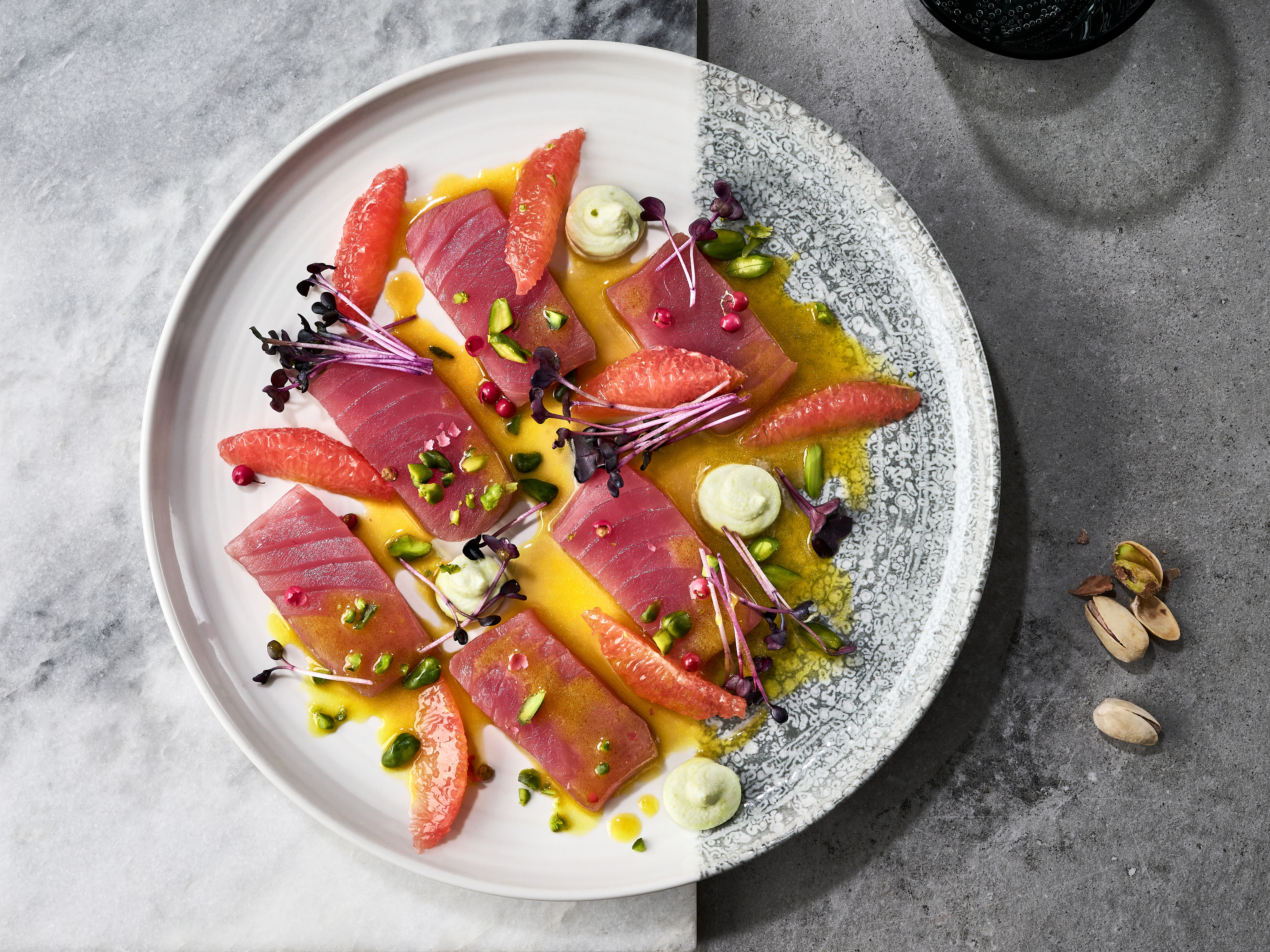 Roher Thunfisch in Sashimi-Qualität, pink Grapefruit, Pistazien und Wasabi, angerichtet wie ein Gemälde. Mit diesem köstlichen Kunstwerk werden Sie Ihre Gäste in jeder Hinsicht beeindrucken!