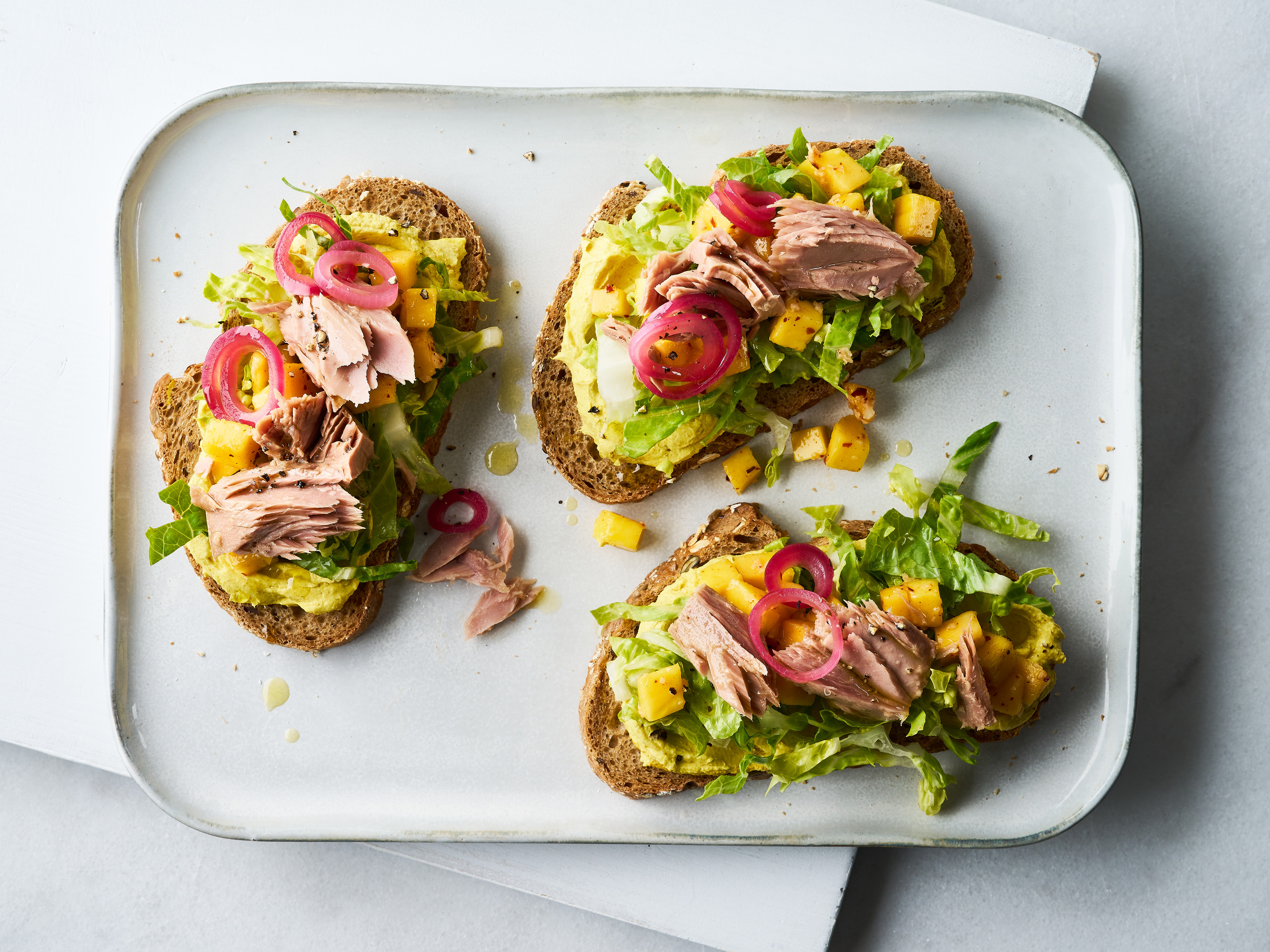 - 4 Brotscheiben mit der Currycreme bestreichen und den Salat darüber verteilen. Den Thunfisch aus der Dose nehmen, abtropfen lassen und darauf anrichten. Marinierte Zwiebeln und Mangowürfel darüber verteilen.