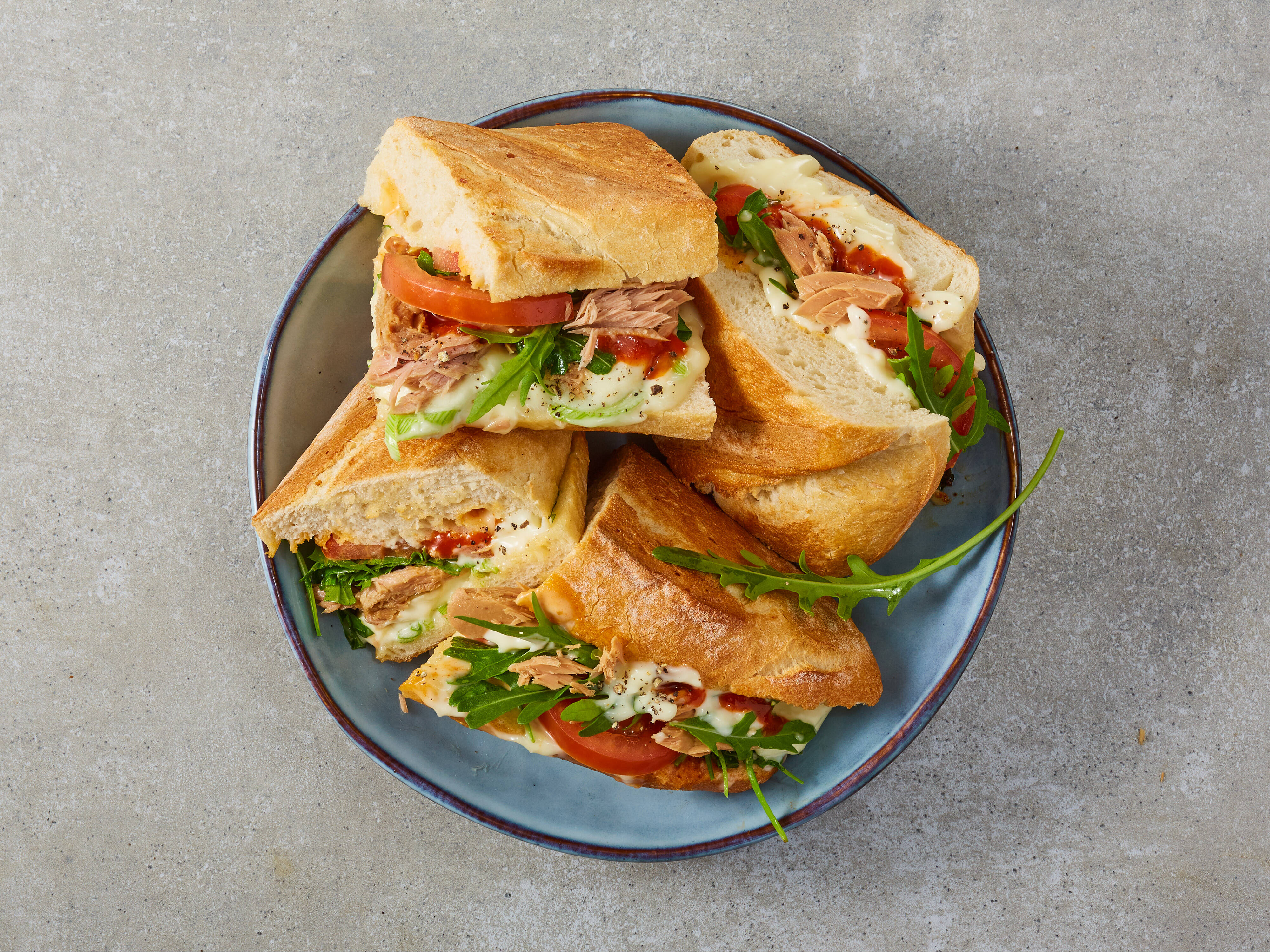 Saftiger Thunfisch und geschmolzener Mozzarella mit Tomaten, Rucola, Mayonnaise und Frühlingszwiebeln zwischen knusprigem Baguette – so geht unser Thunfischsandwich de Luxe.