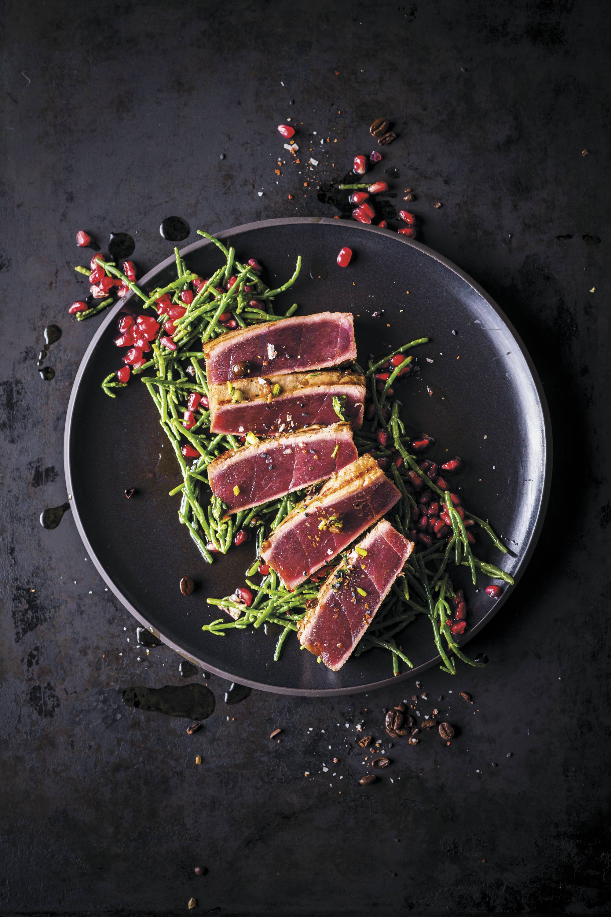 Den Thunfisch aus der Marinade nehmen und in einer Grillpfanne bei sehr starker Hitze circa 30 Sekunden von jeder Seite braten, anschließend in Scheiben schneiden und auf dem Queller-Granatapfelsalat anrichten.