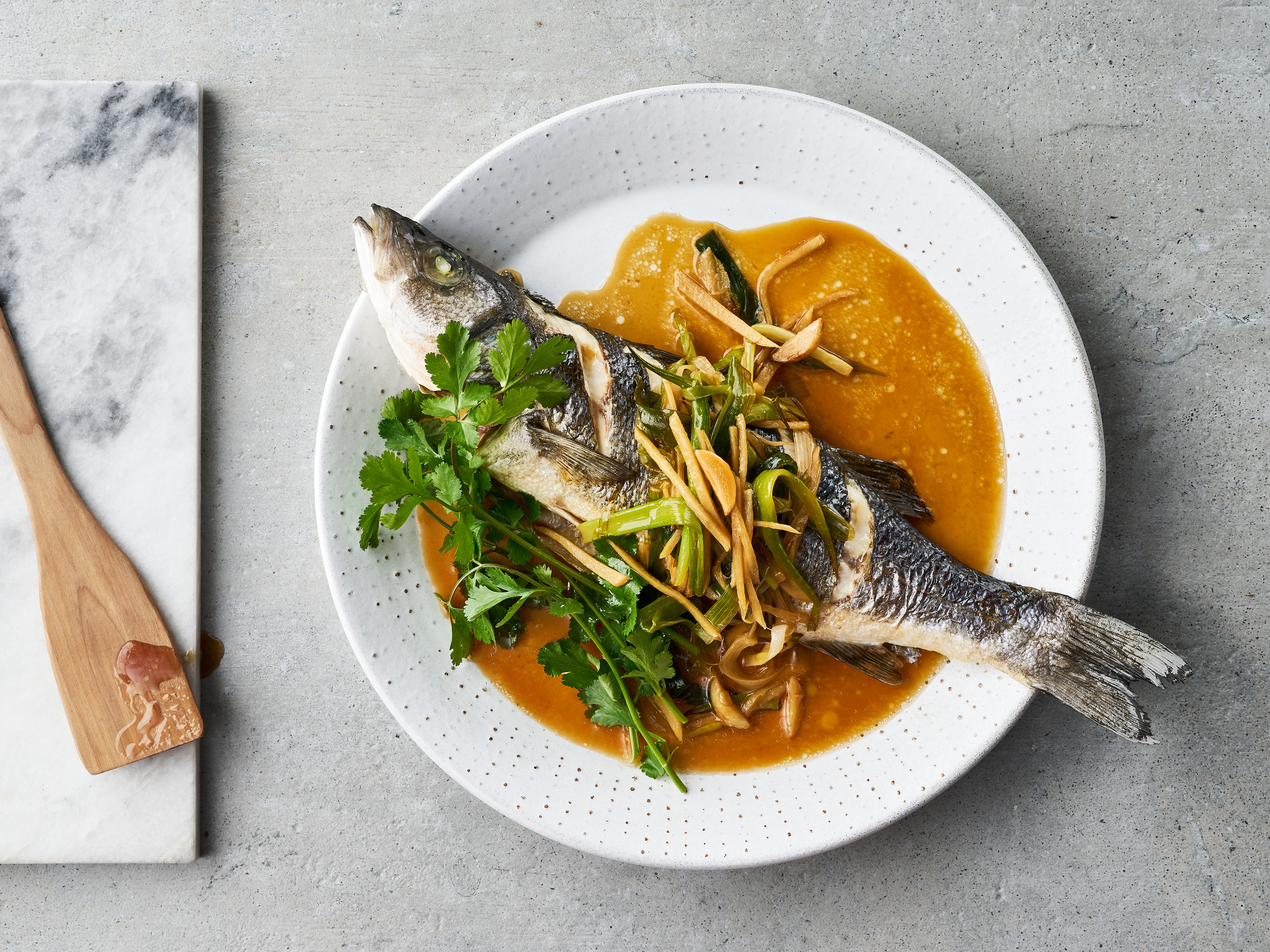 Wolfsbarsch ist der perfekte maritime Sonntagsbraten. Hier kriegt der Ofenfisch einen asiatisch aromatisierten Guss mit viel Ingwer und Knoblauch, frischen Kräutern und Sojasauce.