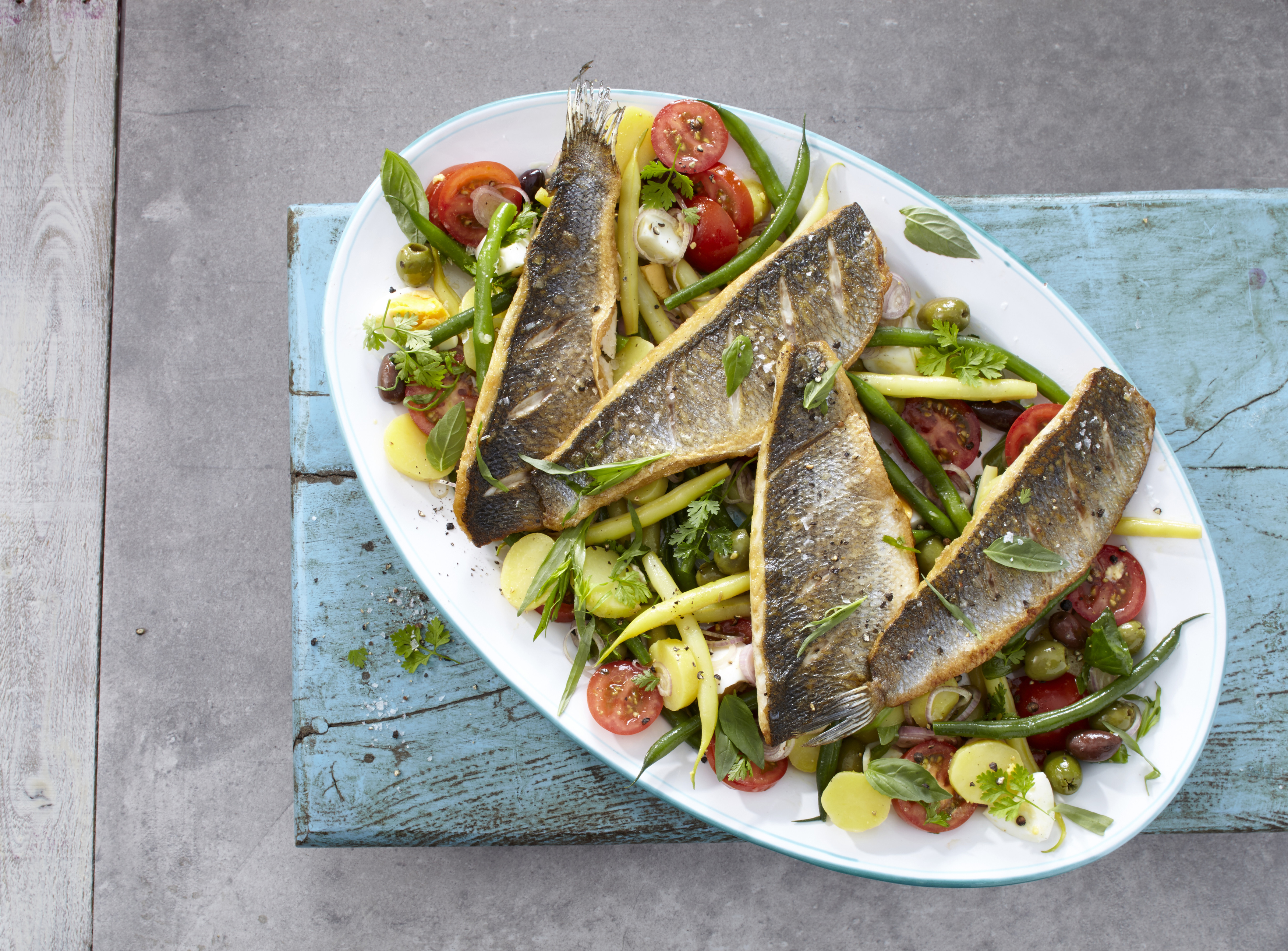 Nizza-Salat – der Salat der französischen Mittelmeerküste. Klassisch mit Thunfisch, in diesem Rezept mit kross gebratenen Wolfsbarschfilets.