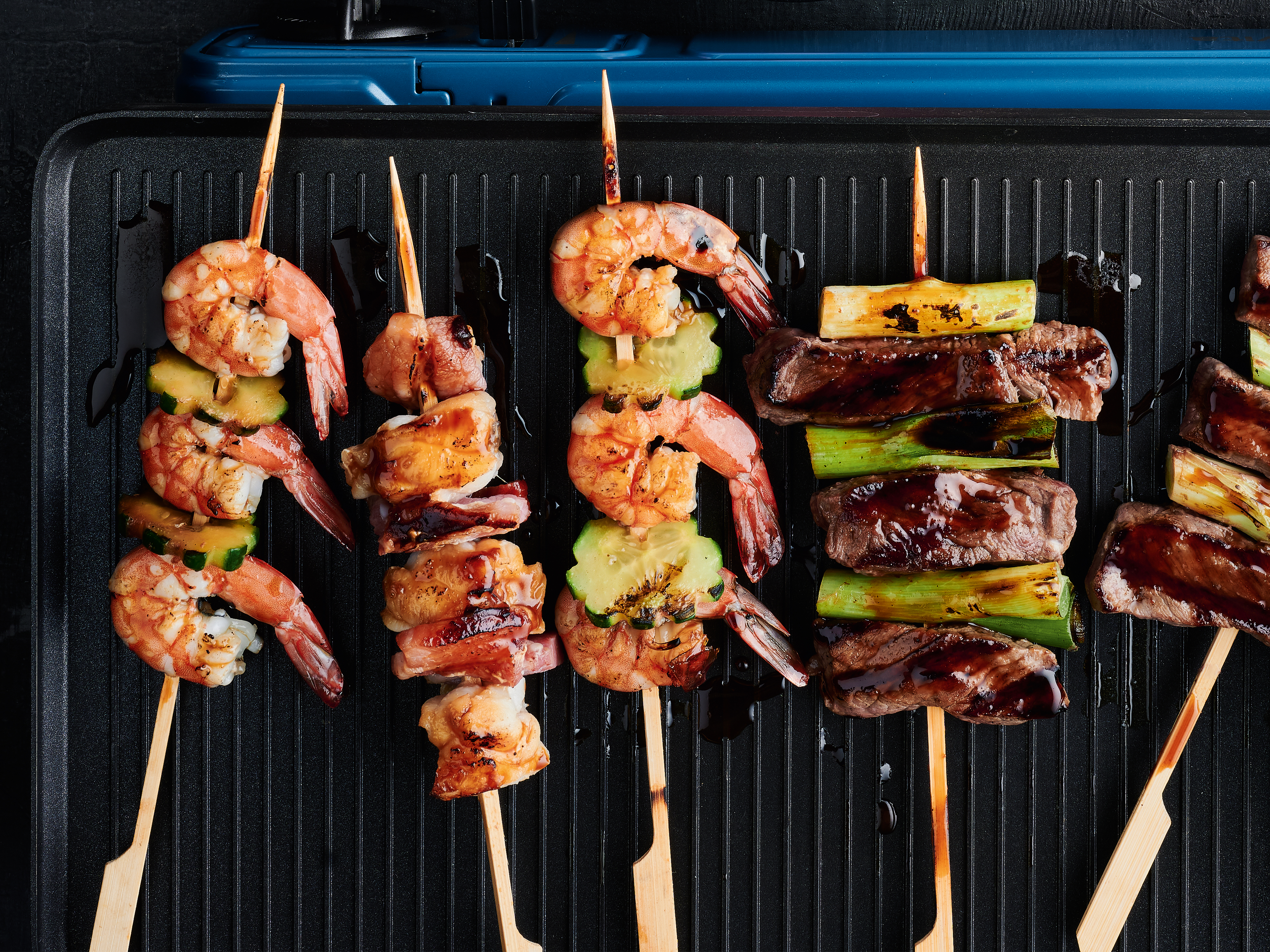 In Reih und Spieß: Seeteufelfilet, Garnelen und Rib-Eye schmackhaft begleitet von Frühlingslauch, Gurken und dicken Speckscheiben. Da fehlt nur noch der Yakitori-Lack...