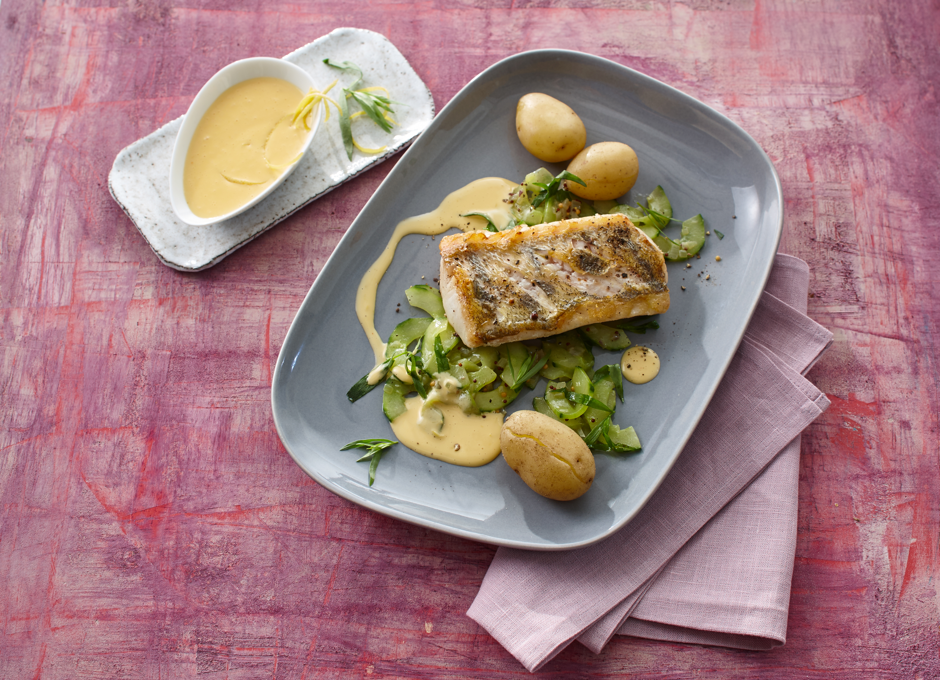 Der Frühling kann kommen: Kross gebratenes Zanderfilet trifft fein gedünstete Estragon-Gurken mit selbstgemachter Zitronenhollandaise.