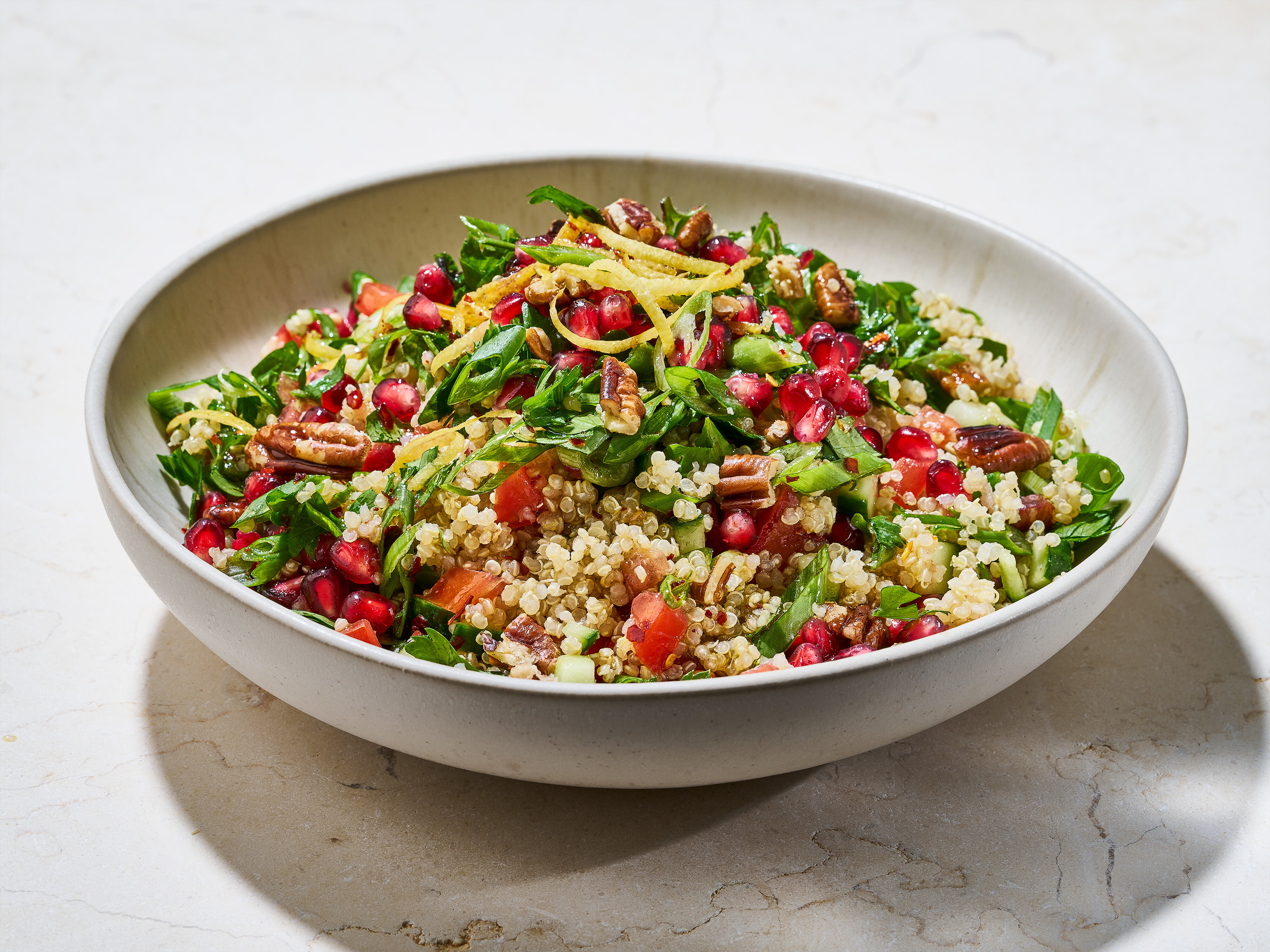 Upgrade: Geröstete Salz-Pekannüsse 50g Pekannüsse grob hacken und in einer Pfanne ohne Öl kurz rösten. Anschließend 1 EL Olivenöl dazugeben, mit etwas Meersalz würzen, vermengen und über den Taboulé streuen.