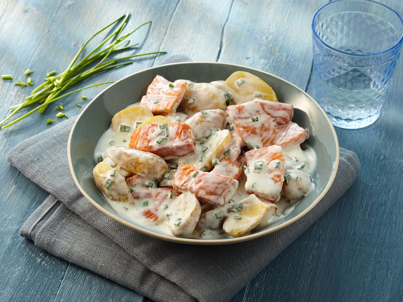 Fischertopf · 400g Zarte Heringsfilethappen (34%) und knackige Shrimps (16%) aus einer MSC-zertifizierten, nachhaltigen Fischerei in einem feinen Dressing aus leichtem Joghurt, herzhafter Mayonnaise und würzigem Dill.