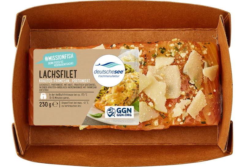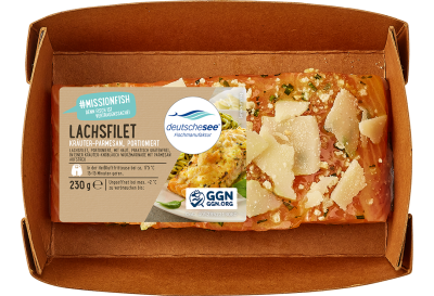 Aus Aquakultur in Norwegen, mit Haut, praktisch grätenfrei, portioniert, in einer Kräuter-Knoblauch-Würzmarinade, mit Parmesan-Aufstreu, unter Schutzatmosphäre verpackt