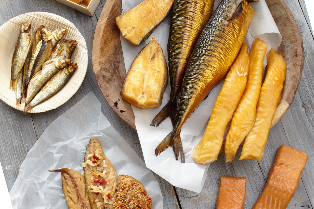 Heißgeräucherte Räucherfisch Mixbox mit Lachsfilet mit einer Kabeljau-Kräuter-Knoblauch-Farce, Tilapiafilet, Makrelenfilet natur mit Haut und Makrelenfilet mit Haut und einer Pfefferauflage.
