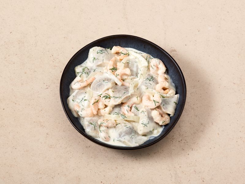 Zarte Heringsfilethappen (34%) und knackige Shrimps (16%) aus einer MSC-zertifizierten, nachhaltigen Fischerei in einem feinen Dressing aus leichtem Joghurt, herzhafter Mayonnaise und würzigem Dill.