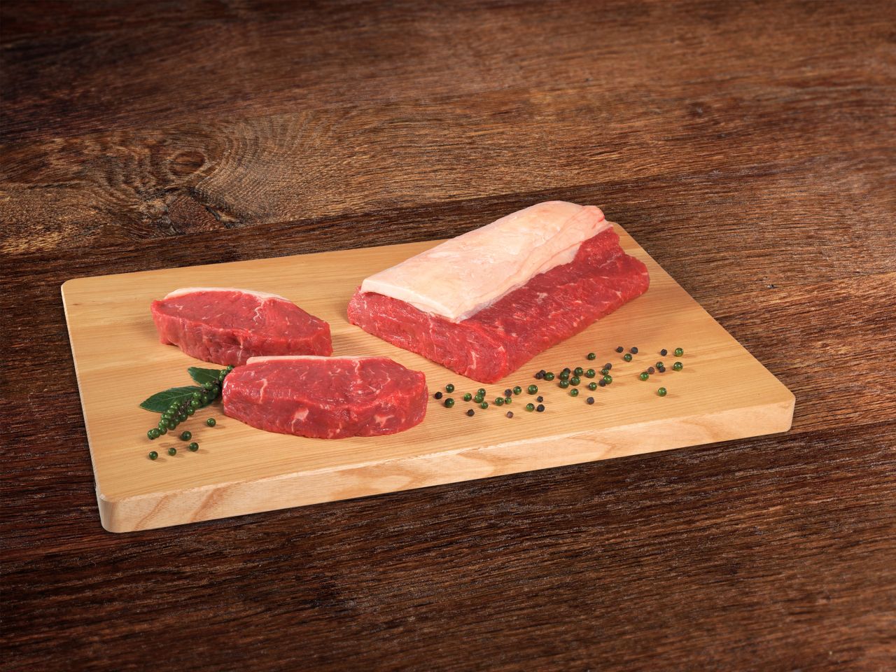 Chateaubriand – doppeltes Steak aus dem Kopf oder Mitte des Filets vom grasgefütterten, britischen Rind. Von Hand geschnitten, ohne Silberhaut, ohne Oberflächenfett. Traditionell bis zu 28 Tage gereift. Tiefgefroren.