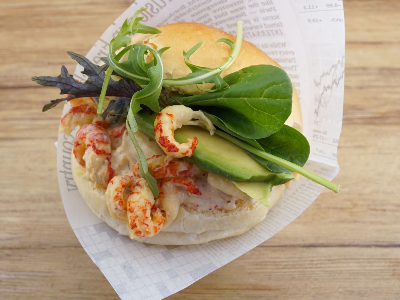 Flusskrebse (32%), Champignons, grüner Spargel und Staudensellerie, in herzhaft gewürzter Mayonnaise, verfeinert mit Weinbrand und Dill.
