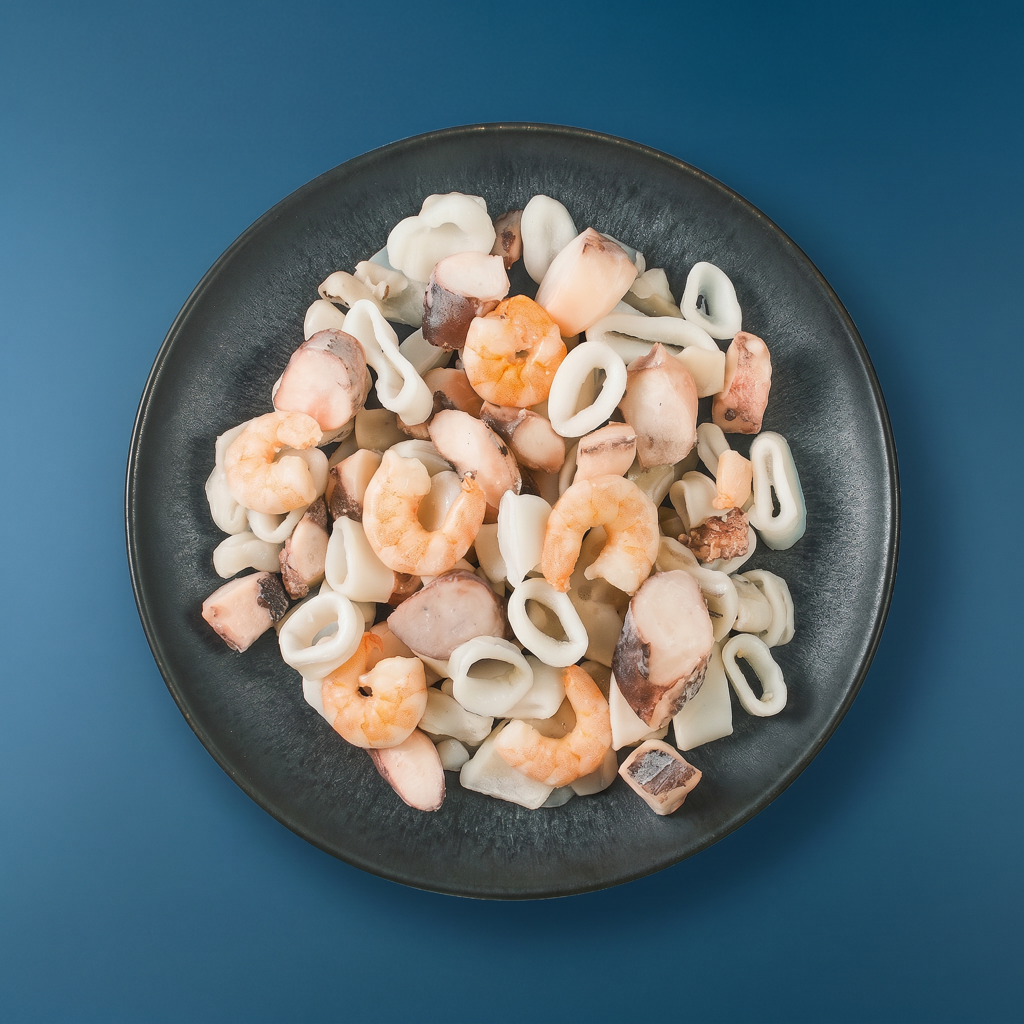 Tiefgekühlt. Vorgegart. Garnelen. Muschelfleisch. Tintenfisch. In der praktischen 2-Kammer-Verpackung.