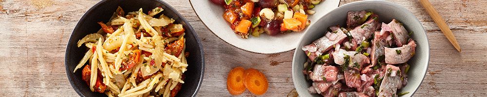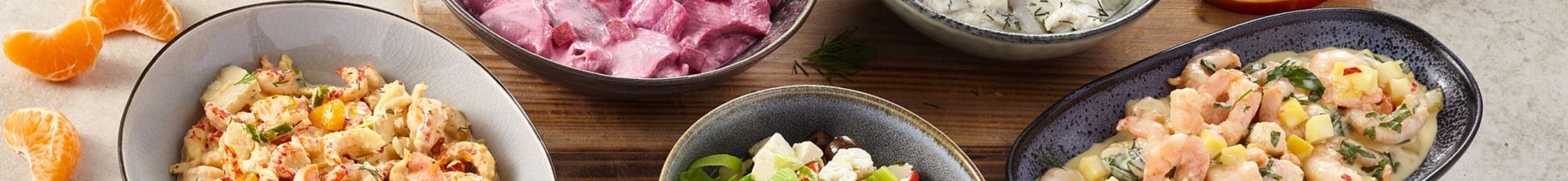 In unserer Feinkostmanufaktur in Bremerhaven stellen wir in mühevoller Handarbeit viele verschiedene Feinkostsalate her: Mit Fisch & Meeresfrüchten, aber auch vegetarisch – perfekt für ein Buffet oder einfach zum Snacken.