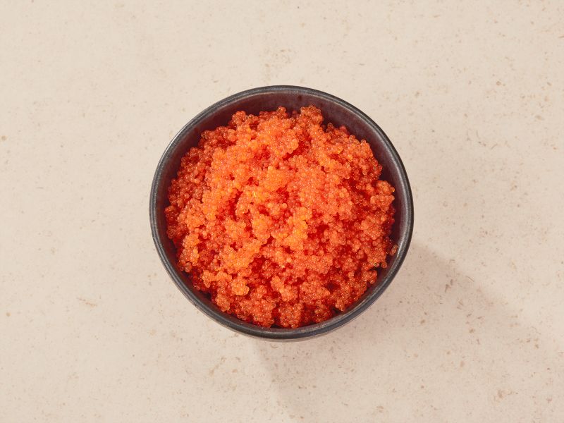Vom fliegenden Fisch. Sehr feines, leuchtend orangenes Korn. Gewürzt & Gesalzen. Pasteurisiert. Perfekt für z.B. Sushi, Poké, Bowls und Tatar.